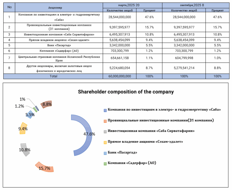 На конец финансового года, завершившегося 20 марта 2025 год (30 исфанда 1403 г.), структура акционерного капитала компании представлена в таблице ниже: